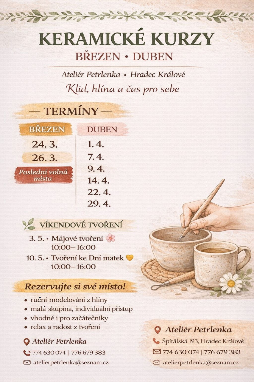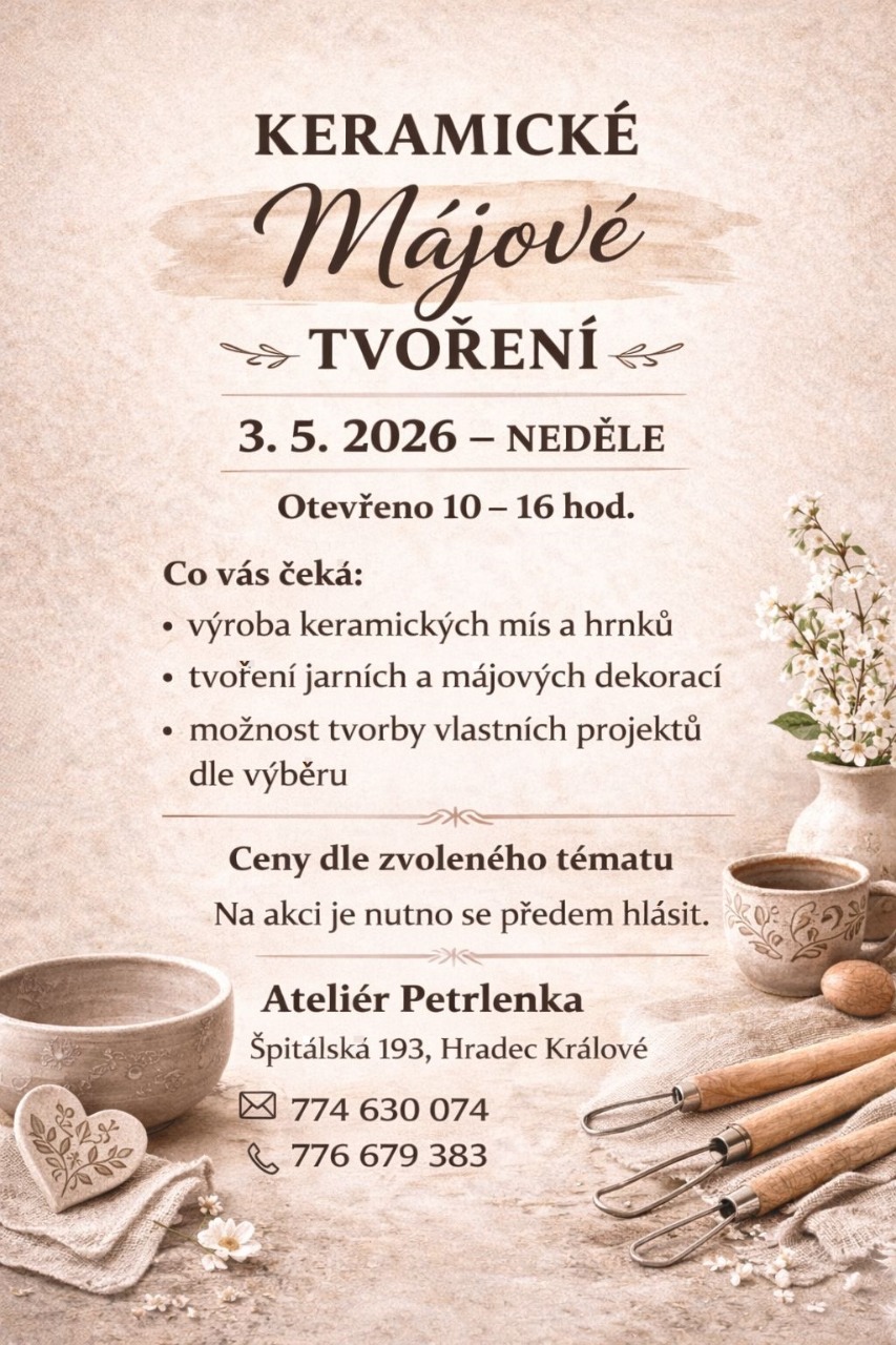 Tvořit v naší veřejné keramické dílně můžete v závislosti na vašem volném čase. Od pondělí do pátku je vám dílna k dispozici kdykoliv v pracovní době. Je ovšem nutné si zavolat a domluvit návštěvu předem, jelikož občas jezdíme na workshop do škol a školek nebo ony k nám. Tak aby jste nepřišli k zavřeným dveřím.